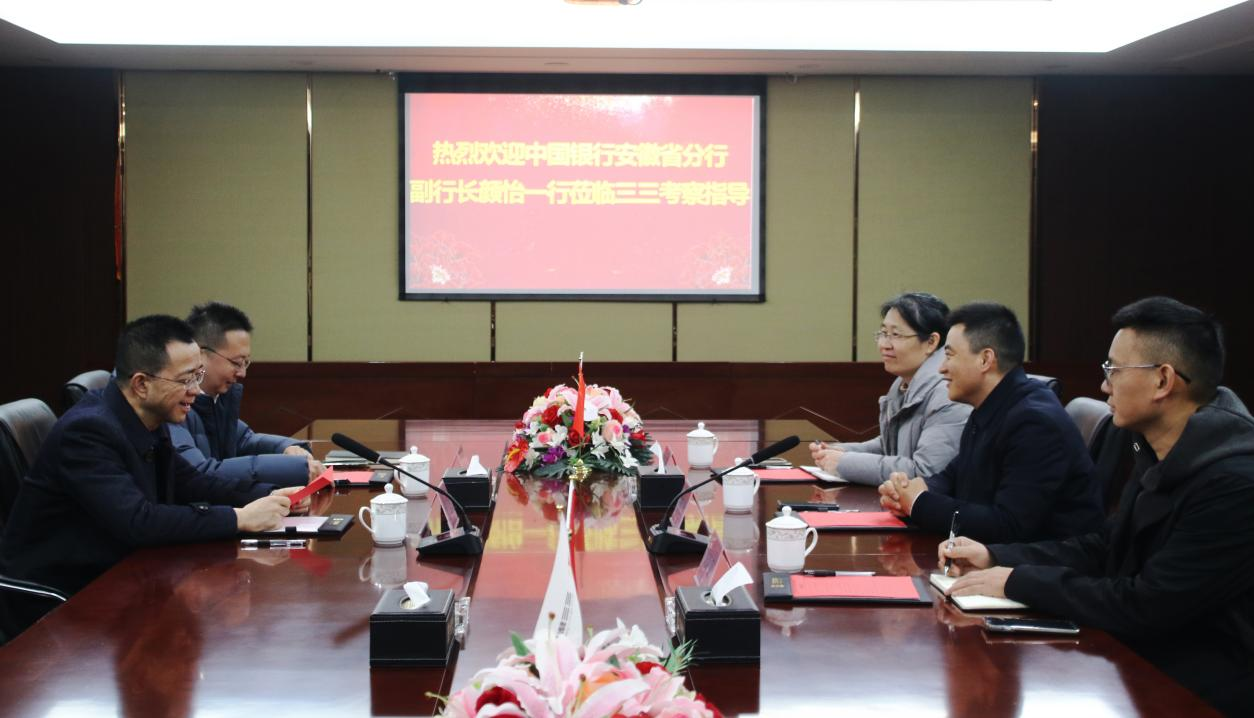 2024年12月30日下午,中國銀行安徽省分行副行長、合肥分行行長顏怡,中國銀行合肥高新區(qū)支行行長梁慶慶一行蒞臨三三集團考察調(diào)研。安徽三三集團執(zhí)行董事、總裁宋曉光率集團副總裁、計劃財務(wù)中心總監(jiān)陸曉鋼、金融管理中心總監(jiān)朱艷共同接待了來賓一行。
