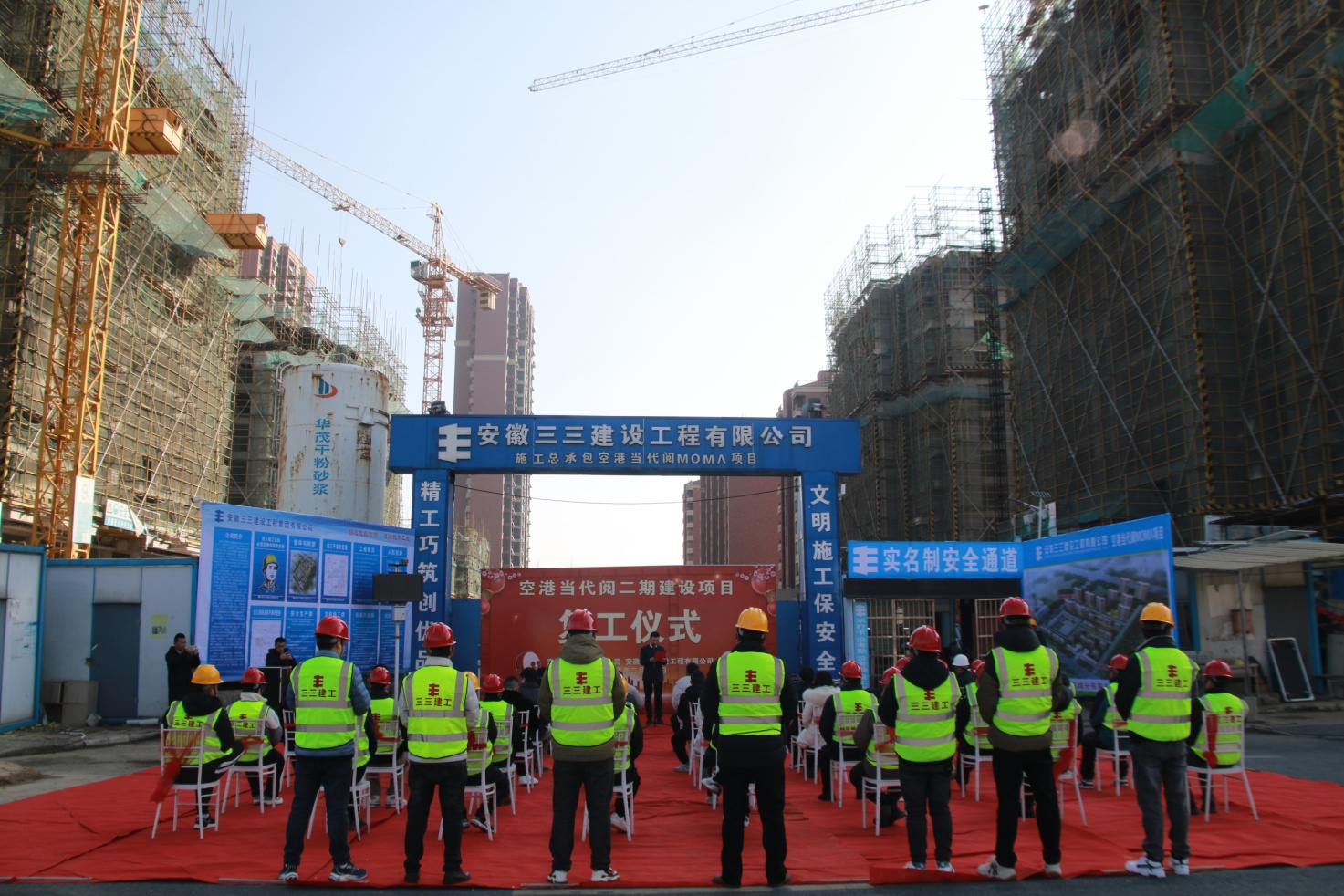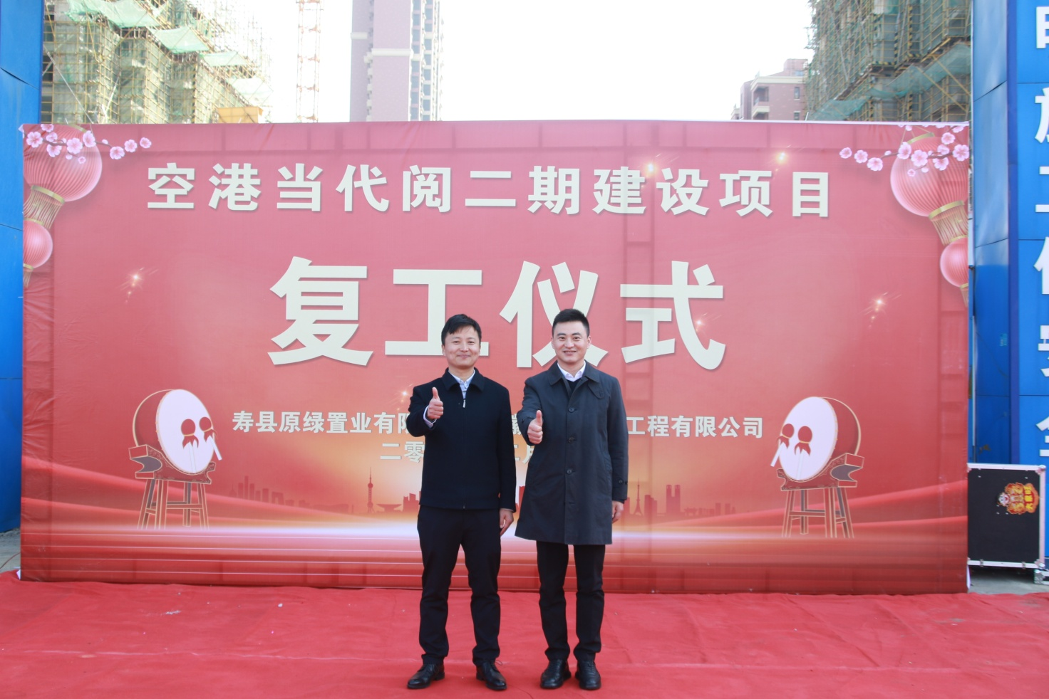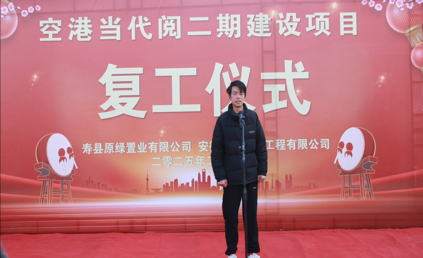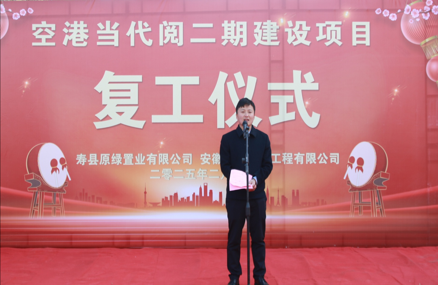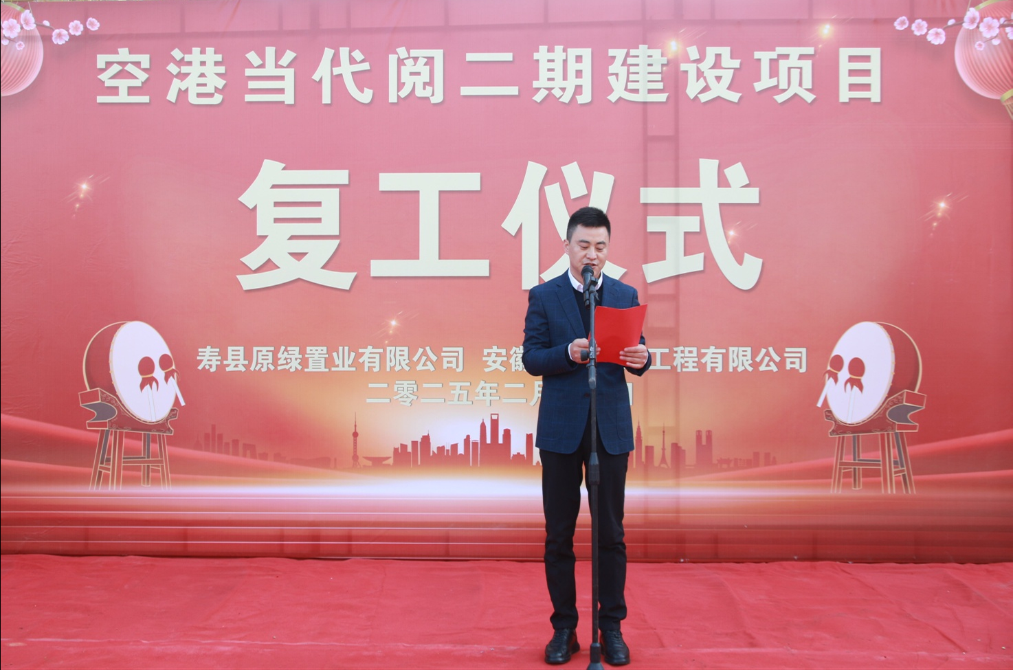 2025年2月13日(正月十六)上午9時58分,在壽縣新橋國際產業園內的空港當代閱二期建設項目現場鞭炮齊鳴,熱鬧非凡,項目復工儀式正在此舉行。壽縣經開區自規局朱濤局長、不動產登記中心蔣國斌主任、重點局鮑龍主任、新橋投資公司投融資部楊智勇總經理以及壽縣原綠置業公司總經理陳自闖、南巽監理公司總監汪衛民、三三集團總裁兼三三建工執行董事宋曉光、三三建工總經理王利民、二期購房業主代表等領導和嘉賓蒞臨現場,共同見證這一新篇章的開啟。復工儀式由宋曉光總裁主持。